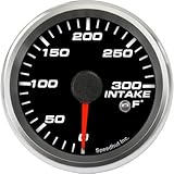 | ✚✚✚ Speedhut 2-5/8" Intake Temp Gauge 0-300F (w/ warning) New ultra-low temp Intake temp gauge. Gauge reads from 0-300F. An internal microprocessor controls the needle movement through a digital stepper motor. The high torque of the stepper motor ensures accurate pointer movement without vibration in all race conditions. A high accuracy Type K thermocouple 108 inches long is included with the gauge for highest accuracy. Set-able warning LED. Peak recall memory shows maximum peak. A super thin (easy for gauge pods) composite carbon case design allows easy mounting in tight locations. Can be mounted in 2-1/16 in. or 2-5/8 in. gauge hole. Can be mounted in 2-1/16 in. gauge pod. Bright anodized solid Aluminum bezel! A unique Spin lock ring is included for ease of installation and a total custom look.