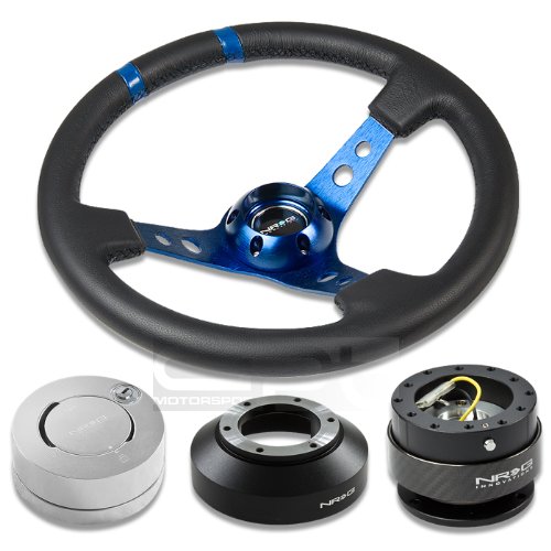 NRG-SRK-141H+200CF+101LS+016RBL, NRG Innovations 13.78" 350mm 3" Deep Dish Style Black Leather Blue Center Marking Blue Spokes Racing Steering Wheel Combo with 6 Hole Short Hub Adapter with Gen 2.0 Carbon Quick Release with Silver Lock Hub Kit SRK-141H